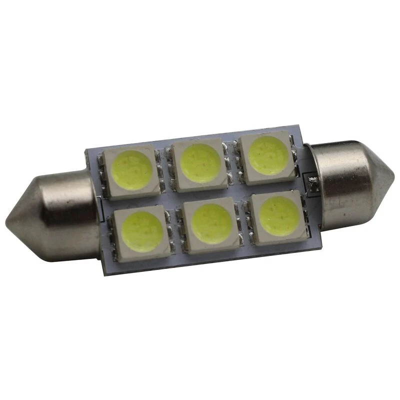 This bulb replaces and has similar brightness to 3 to 5 watt Halogen/Filament Festoon bulbs on 24 volts. Fits many 36-41mm sockets. This is the standard length festoon. 22-28VDC input range. Cross reference #’s 3910, 3423, 3425, 6411, 6423 6461, 3710, 6418, 6486X, 6461, 6418LL.