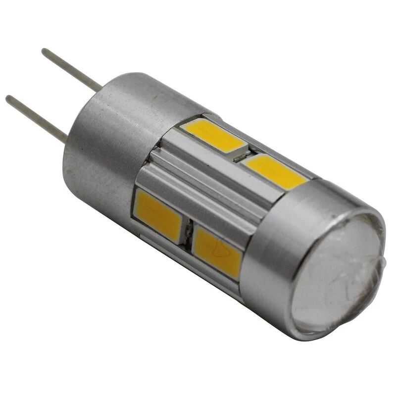 This bulb replaces and has similar brightness to Mini/micro 10 and 15 watt traditional G4 bi-pin bulbs using the small/short globe. Cross reference #’s G4 T3 JC JC10 JC15. 11-14VDC input range. 270 max lumens, radiates in all directions.
