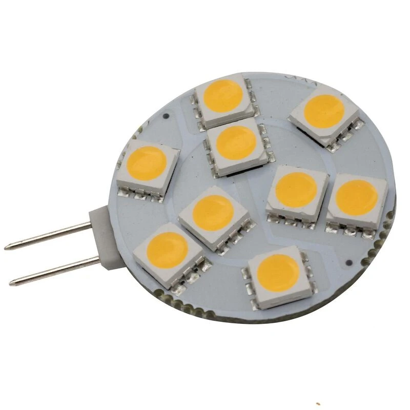 This bulb replaces G4 bulbs, and other LED disk modules with side pins. 10-16VDC input range – constant power. 90 max lumens. Similar brightness to a 4 or 5 watt halogen G4 JC5. Commonly used in dome lights and reading lights. Low eye strain bright warm white. Dimmable from 7.5-10V. 1 1/8″ diameter. Extremely long life. Smart driver included in this light is not +/- polarity sensitive.Â