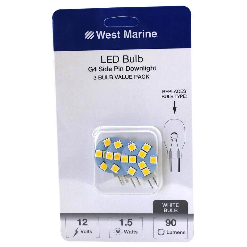 The WEST MARINE G4 Side Pin Downlight LED Disk Bulb has been designed as a replacement and upgrade for standard halogen, Xenon and incandescent filament bulbs, offering dramatically lower power consumption and heat generation, while having much greater lifetime and shock resistance. For even greater light output and quality as well as higher efficiency (more light per watt) please look to our Premium series bulbs.