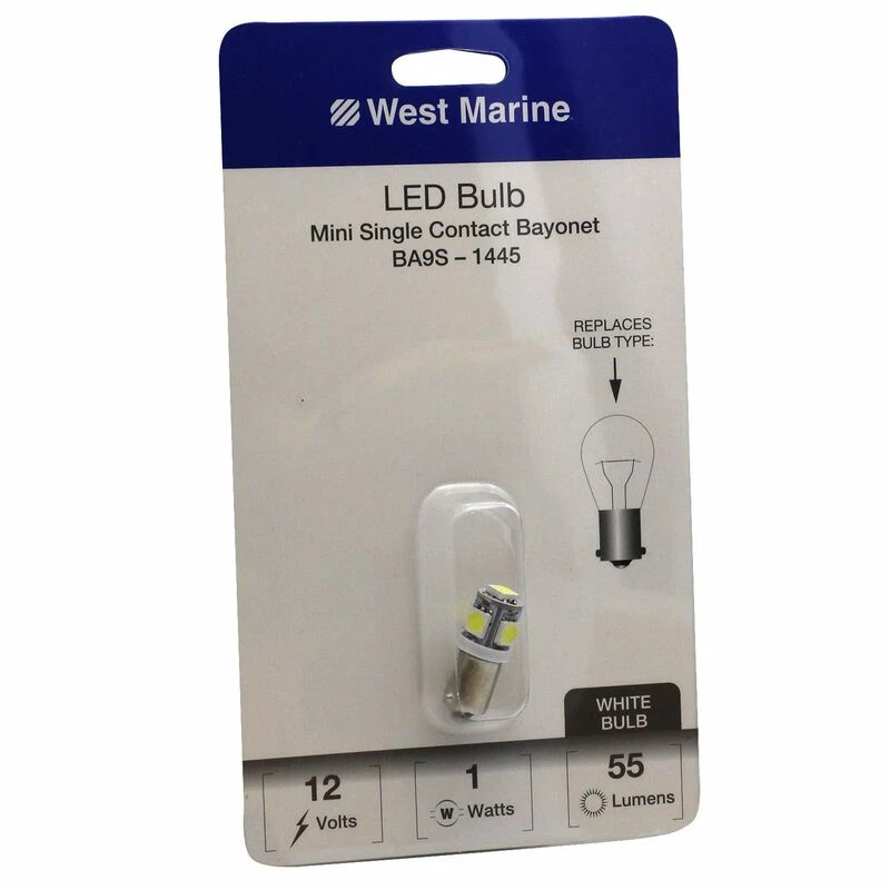 The WEST MARINE Mini Single Contact Bayonet BA9S-1445 LED Bulb has been designed as a replacement and upgrade for standard halogen, Xenon and incandescent filament bulbs, offering dramatically lower power consumption and heat generation, while having much greater lifetime and shock resistance. For even greater light output and quality as well as higher efficiency (more light per watt) please look to our Premium series bulbs.