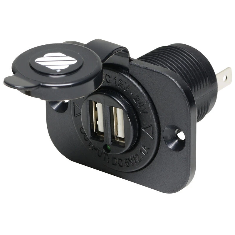 The West Marine Panel-Mount Dual USB Charger Socket is easy to install and offers compatibility with USB electronic devices that use a standard USB socket for charging. Its 2.1A rating allows charging two small devices simultaneously or one large device. Includes weatherproof cap to keep out dust and moisture when not in use.
