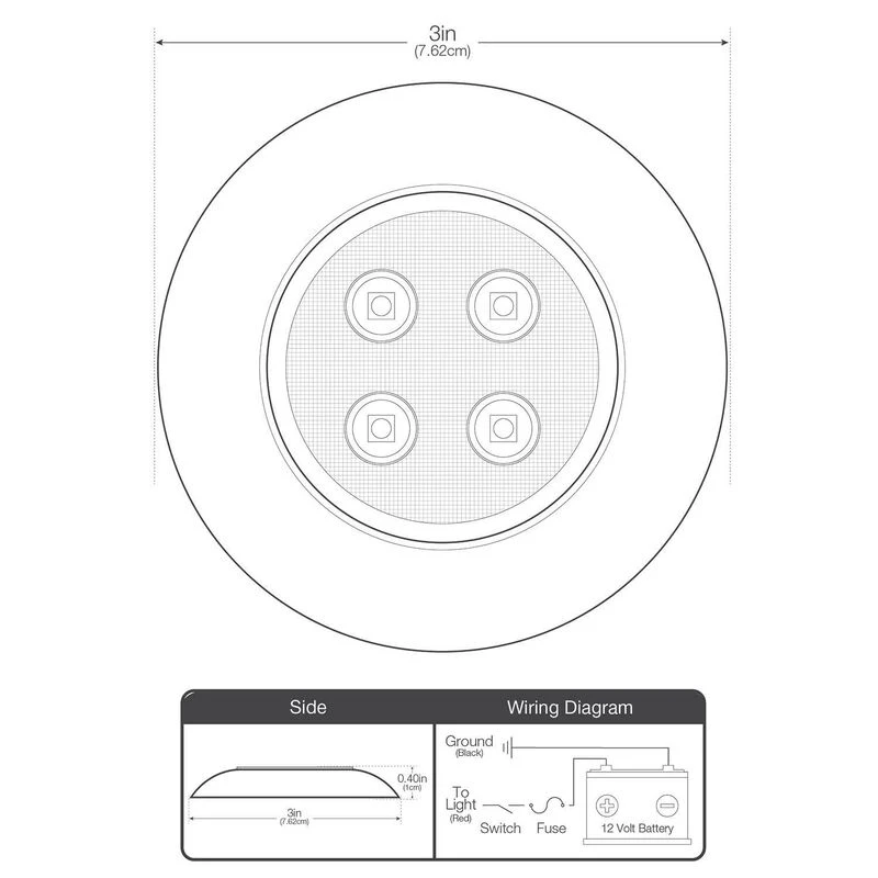 Stainless steel 3″ diameter interior light features filament-free, vibration-poof LED elements that combine low draw with incredible longevity and reliability. Require external switch.