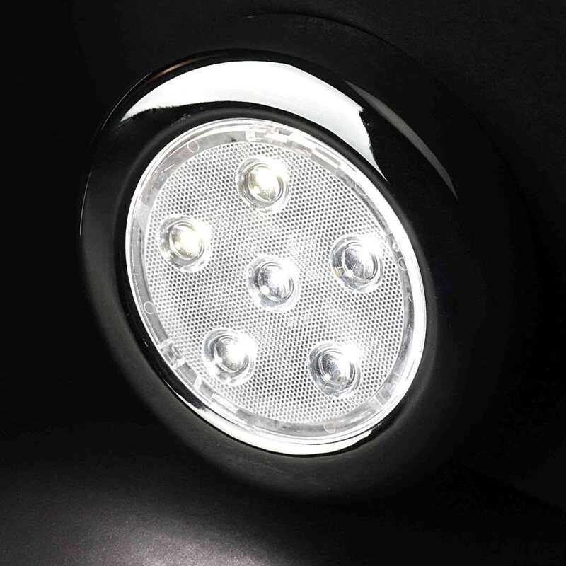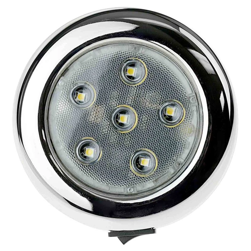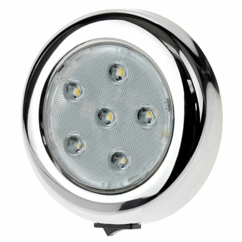 Stainless steel 4″ diameter interior light features filament-free, vibration-poof LED elements that combine low draw with incredible longevity and reliability. With integrated ON/OFF switch.
