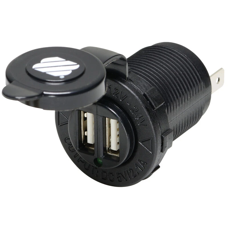 The West Marine Surface-Mount Dual USB Charger Socket is easy to install and offers compatibility with USB electronic devices that use a standard USB socket for charging. Its 2.1A rating allows charging two small devices simultaneously or one large device. Includes weatherproof cap to keep out dust and moisture when not in use.